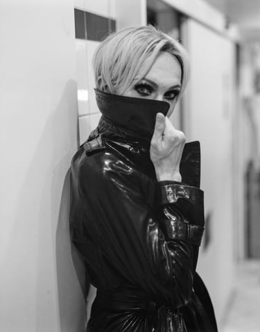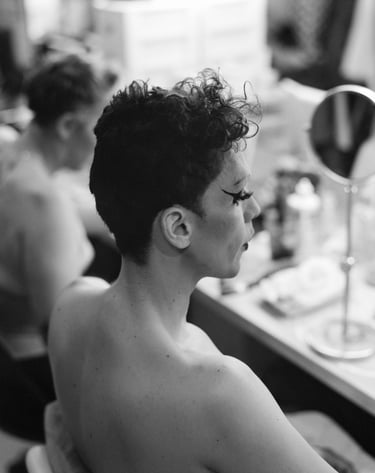 Portrait de l'artiste Eva Carlton juste avant de monter sur scène pour le numéro qui ouvre le spectacle (le prologue).
