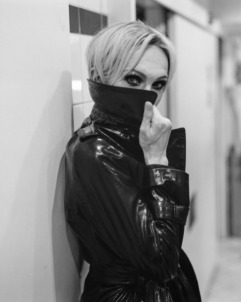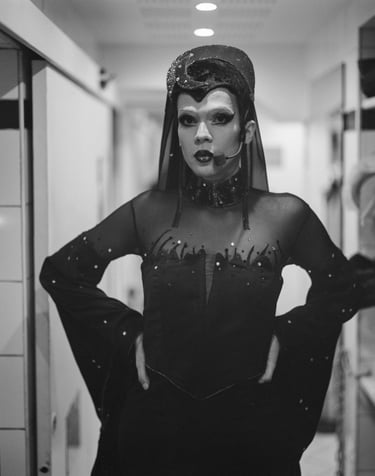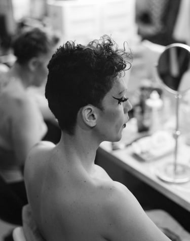 Portrait de l'artiste Eva Carlton juste avant de monter sur scène pour le numéro qui ouvre le spectacle (le prologue).