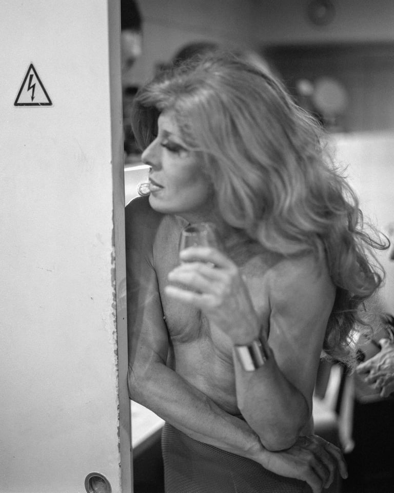 Eva Carlton en Dalida, grande amie de Michou. Une coupe de champagne à la main.