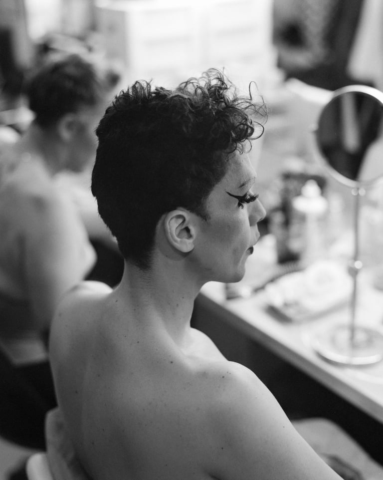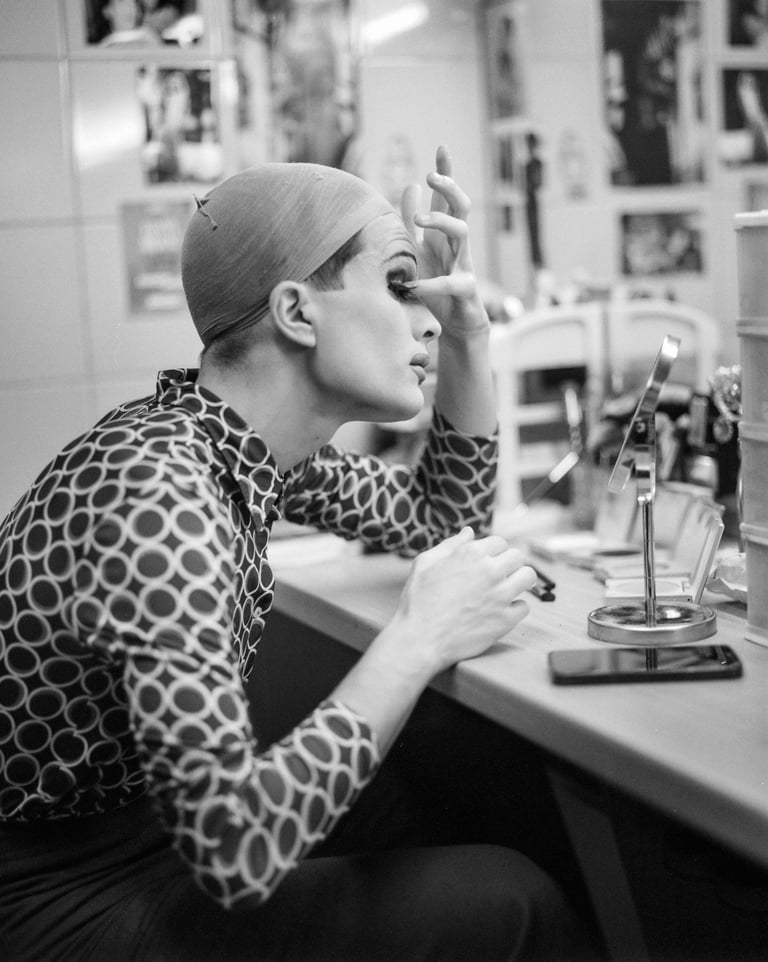 Je passe alors au moyen format argentique, seulement dix poses par pellicule. Tandis que la soirée s’emballe c’est une invitation à ralentir, à prendre le temps de ressentir. Je cherche à capturer la vérité derrière le maquillage, cette émotion sincère que ressentent les artistes avant de fouler une dernière fois ces planches qui ont marqué leur vie pendant tant d’années.
